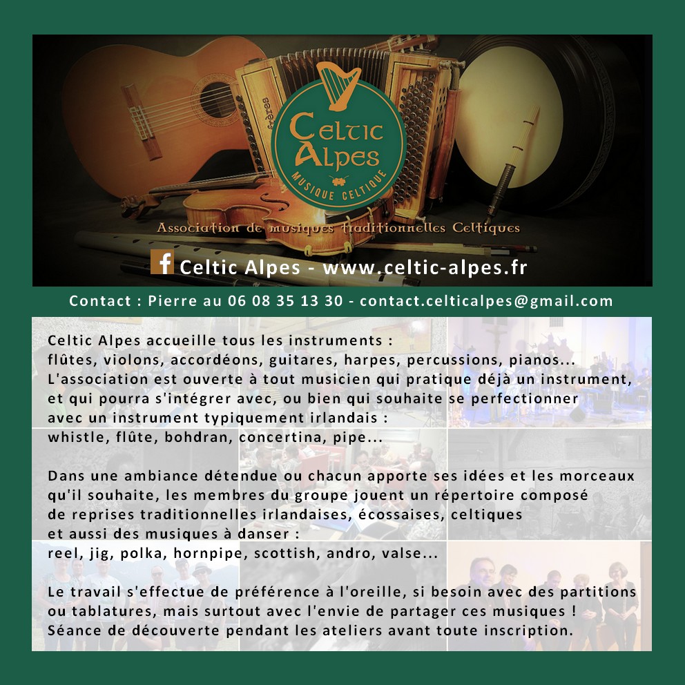 Celtic Alpes est une association de type loi 1901, née de la rencontre en 2007 de quelques musiciens désireux d'apprendre un peu de la musique traditionnelle Irlandaise et de faire vivre localement celle-ci (en Savoie, Haute-Savoie, Isère...), en fonction de leurs modestes moyens.
